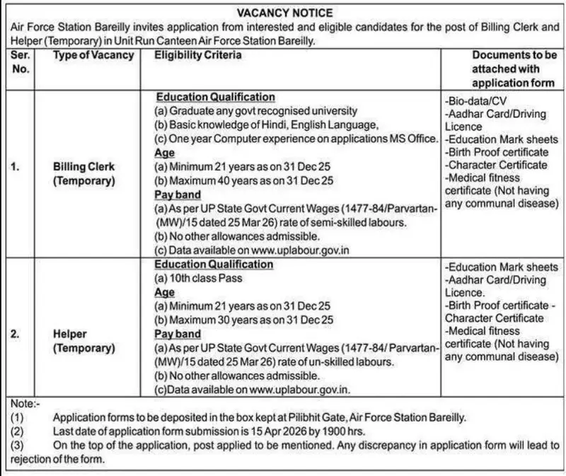 - Air Force Station Bareilly Billing Clerk और Helper Posts के लिए आवेदन की अंतिम तिथि 15 अप्रैल 2026 है। सुनिश्चित करें कि आप समय रहते अपना आवेदन जमा कर दें।