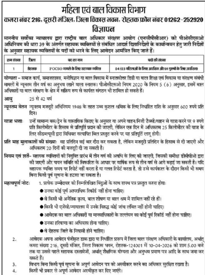 - Step 6: अपना भरा हुआ आवेदन पत्र सभी संलग्न दस्तावेजों के साथ 'District Child Protection Officer, Room No. 216, 2nd Floor, District Vikas Bhawan, Rohtak-124001' के कार्यालय में पंजीकृत डाक (registered post) के माध्यम से या सीधे हाथ से 10 अप्रैल 2026 को शाम 5:00 बजे तक जमा करें।