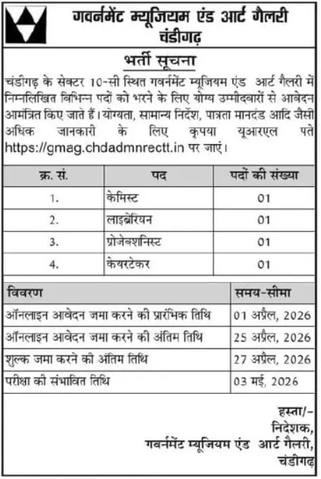 आप Chandigarh jobs 2026 की तलाश में हैं और Government Museum and Art Gallery Chandigarh recruitment का बेसब्री से इंतजार कर रहे थे, तो आपकी तलाश अब खत्म हुई! चंडीगढ़ के प्रतिष्ठित Government Museum and Art Gallery में विभिन्न पदों पर सीधी भर्ती का नोटिफिकेशन जारी हो गया है. यह सिर्फ एक नौकरी नहीं, यह है इतिहास, कला और संस्कृति के बीच काम करने का एक सुनहरा अवसर! Chemist, Librarian, Projectionist और Caretaker जैसे 04 महत्वपूर्ण पदों के लिए आवेदन मांगे गए हैं. तो देर किस बात की? अपनी सरकारी नौकरी का सपना पूरा करने के लिए तुरंत तैयार हो जाइए!