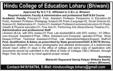 • Post: Hindu College of Education Bhiwani Non-Teaching Posts