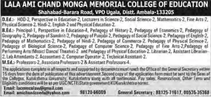 The General Secretary, Lala Ami Chand Monga Memorial College of Education, Shahabad-Barara Road, VPO Ugala, District Ambala, Haryana – 133205.