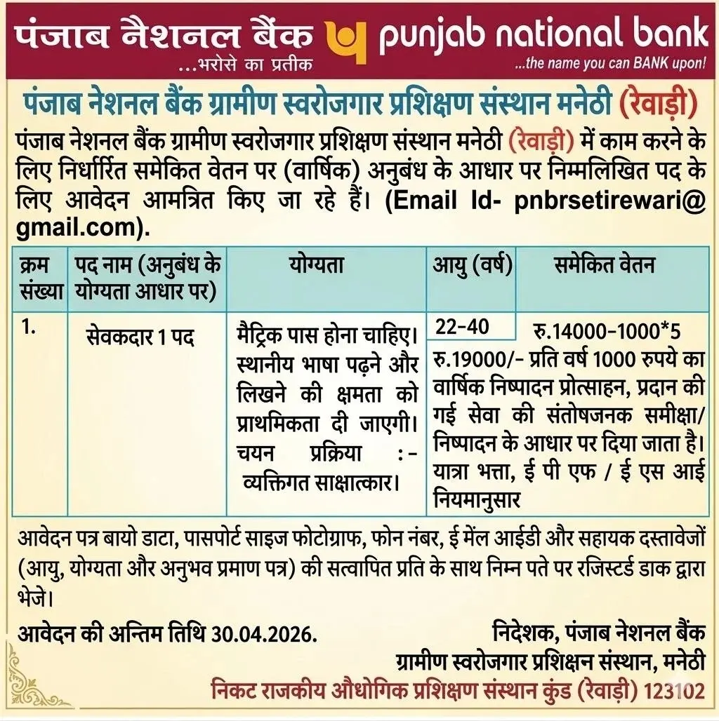 ЁЯУН PNB Bank Rewari Peon Recruitment 2026: Direct Apply Address